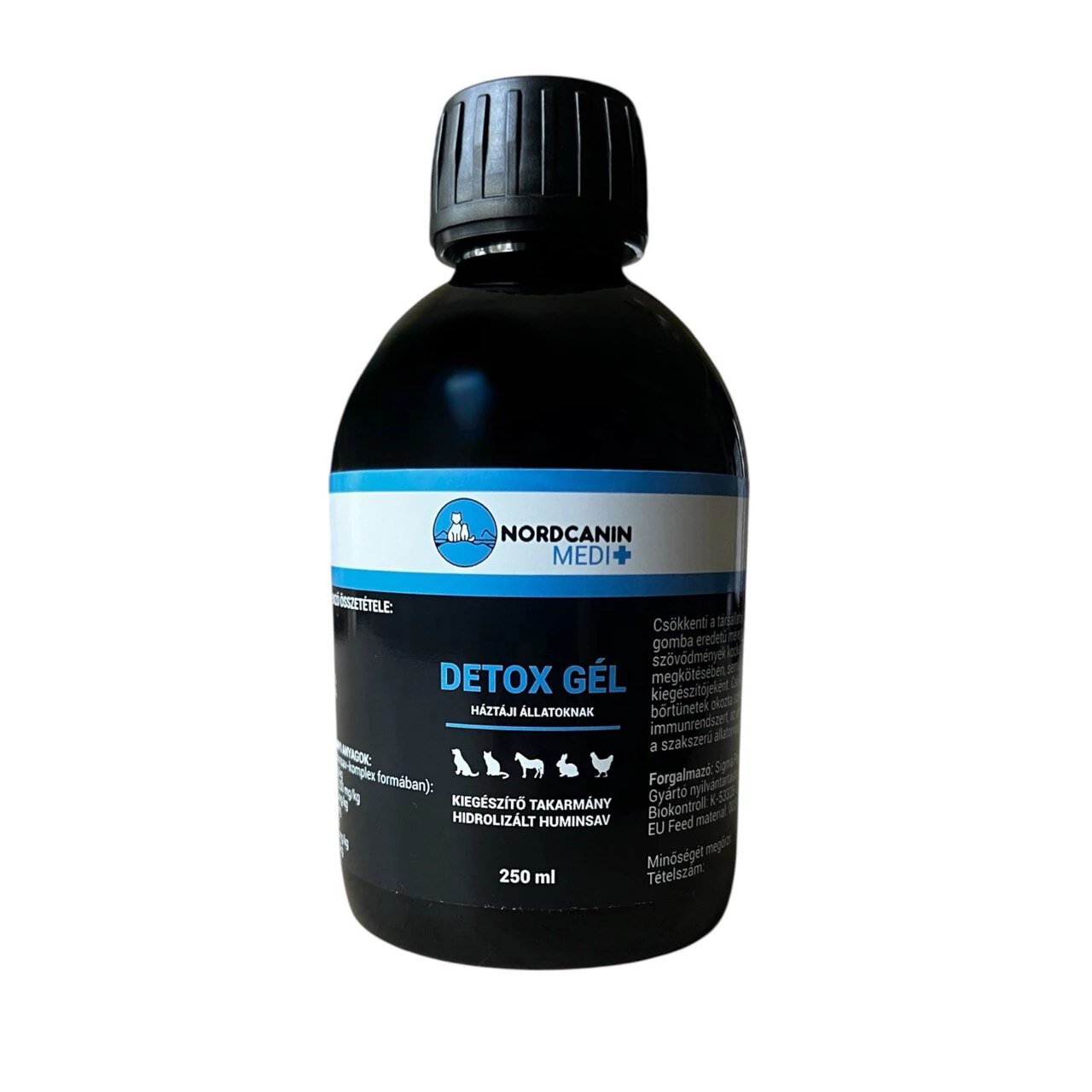 A Nordcanin Medi+ Detox Gél a népszerű hidrolizált huminsav folyékony változata azoknak a gazdiknak, akik folyadékokat könnyebben adagolnak a kedvenceiknek. Kiemelkedő fulvosav tartalmának és a folyadékformulának köszönhetően természetes megoldást kínál a háziállatok allergiás és emésztési panaszainak enyhítésére, méregtelenítésre és az immunrendszer támogatására. Csökkenti a társállatok mérgezései (pl.: vegyszerek, növényi-, állati-, penész és gomba eredetű méreganyagok, nehézfémek, baktérium-toxinok) okozta szövődmények kockázatát. 10x hatékonyabb a szervezetbe került méreganyagok megkötésében, semlegesítésében és eltávolításában, mint az orvosi szén. A Detox Gél minden háziállat étrendjébe könnyedén beilleszthető, legyen szó kisállatokról, nagytestű haszonállatokról vagy hobbiállatokról.