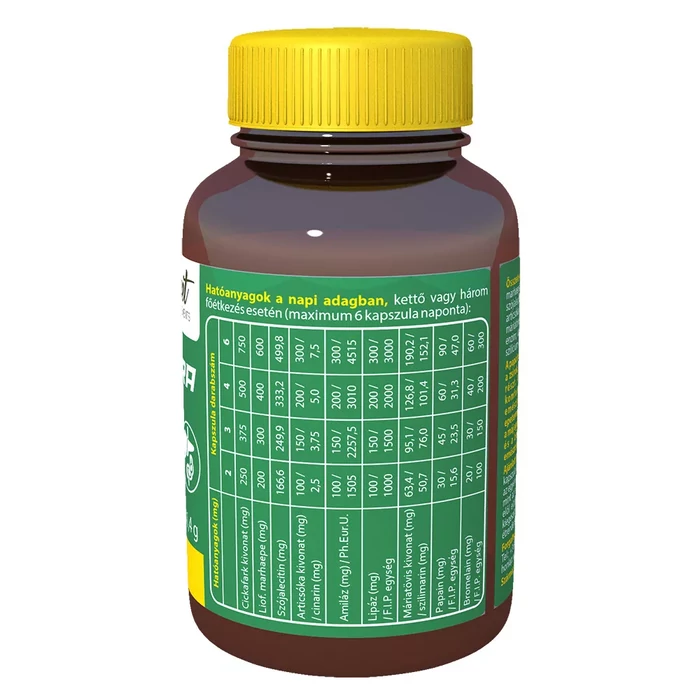 Komplex összetevők: A papain és bromelain fehérjebontó enzimek. A lipáz a zsírok, az amiláz a keményítő emésztésében vesz részt. A cickafark hozzájárul az emésztési komfortérzethez. A máriatövis elősegíti az emésztést, a megfelelő máj-működést, az epetermelést és védi a májat. Az articsóka hozzájárul a máj egészségéhez, a szervezet méregtelenítéséhez és a bélrendszer komfortjához, segíti az emésztőnedvek áramlását.