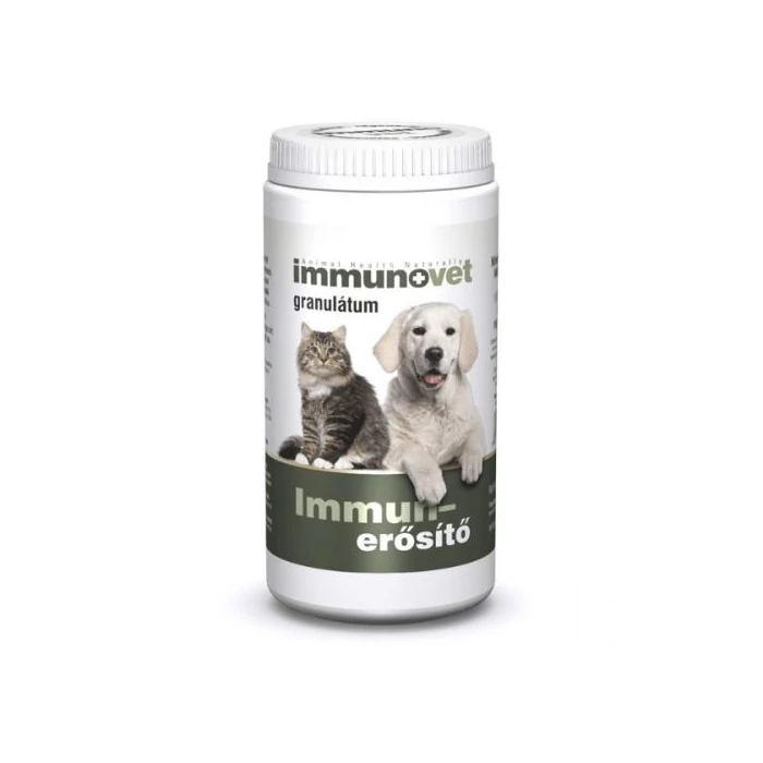 Az Immunovet granulátum eledelbe keverhető étrend-kiegészítő készítmény kutyák és macskák részére. Tapasztalataink szerint a granulátumot a macskák a termék könnyebben fogyasztható por állaga miatt szívesebben fogyasztják. Az Immunovet készítmények támogatják az egészséges állapot fenntartását, segítenek a stresszhelyzetekben, illetve a kisállat egyéb legyengült állapotában. Az Immunovet granulátum színe 2023-ban barnáról sárgásabb árnyalatra vált, mert összetevői közül elhagyjuk a természetes színezéket. Nagyobb hasüregi és csontműtétek során elősegíti a gyógyulást és lerövidíti a lábadozási időt. Fertőző betegségek esetén hatékonyabb az állatok otthoni kezelése. Fokozza a védőoltások hatékonyságát. A sebészi beavatkozások után folyamatosan adva jelentősen javítja az állatok felépülését és egészségi állapotuk helyreállítását. Bőrbetegségekben gyorsítja és tökéletesíti a károsodott bőr- és szőrképletek regenerációját.