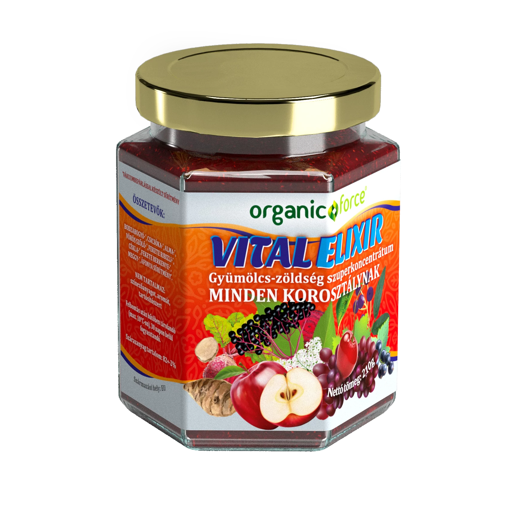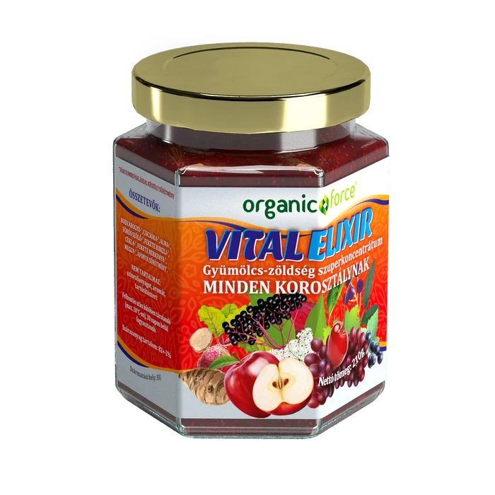 Gyümölcs-zöldség szuperkoncentrátum minden korosztálynak (már 8 hónapos kortól). Természetesen előforduló vitaminokkal és ásványi anyagokkal az immunrendszer és a szervezet erősítéséért, természetes vitaminpótlásért- A VitalElixír egy szuperkoncentrátum, amely 9-féle – magas vitamin és hatóanyag tartalmú – gyümölcs-zöldség sűrítményét tartalmaza: bodzabogyó, csicsóka, alma, vörös szőlő, fekete ribizli, cékla, fekete berkenye, meggy, áfonya.